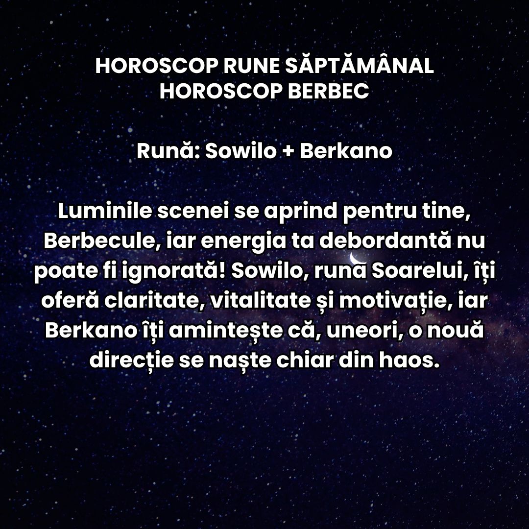 Luminile scenei se aprind pentru tine, Berbecule, iar energia ta debordantă nu poate fi ignorată! Sowilo, runa Soarelui, îți oferă claritate, vitalitate și motivație, iar Berkano îți amintește că, uneori, o nouă direcție se naște chiar din haos. La locul de muncă, se conturează un moment decisiv – fie că este o promovare neașteptată, fie că în sfârșit ți se recunoaște o idee, vei avea parte de un moment de glorie. În relații, un aer de prospețime îți învăluie viața sentimentală, fie printr-o reînnoire a pasiunii într-o relație existentă, fie printr-o întâlnire surprinzătoare cu cineva care îți trezește curiozitatea. Ai grijă la sănătate – cu toată energia pe care o ai, riști să îți consumi rezervele fără să-ți dai seama. În weekend, lasă planurile mărețe deoparte și bucură-te de ceva simplu: o ieșire cu prietenii, o carte bună sau o plimbare lungă sub cerul liber.