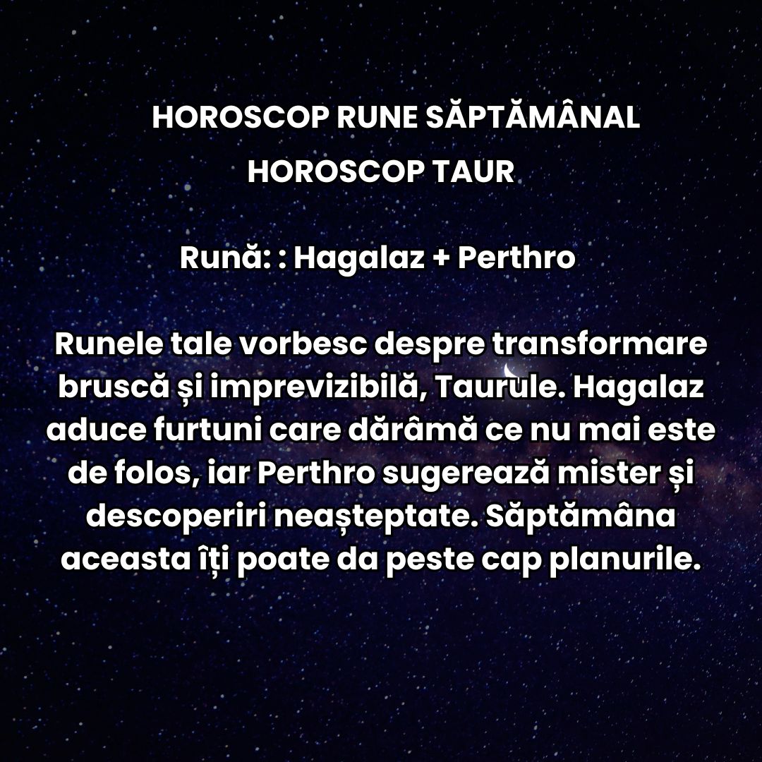 Runele tale vorbesc despre transformare bruscă și imprevizibilă, Taurule. Hagalaz aduce furtuni care dărâmă ce nu mai este de folos, iar Perthro sugerează mister și descoperiri neașteptate. Săptămâna aceasta îți poate da peste cap planurile – o schimbare de macaz la locul de muncă, o veste din trecut sau chiar o revelație personală te pot face să regândești ceea ce credeai sigur. Pe plan relațional, ești într-o fază de introspecție, iar cineva din trecut poate reapărea pe neașteptate. Ai grijă la sănătate – stresul și oboseala se pot aduna, așa că găsește timp pentru odihnă și echilibru. O călătorie sau o discuție cu cineva înțelept îți poate schimba perspectiva.