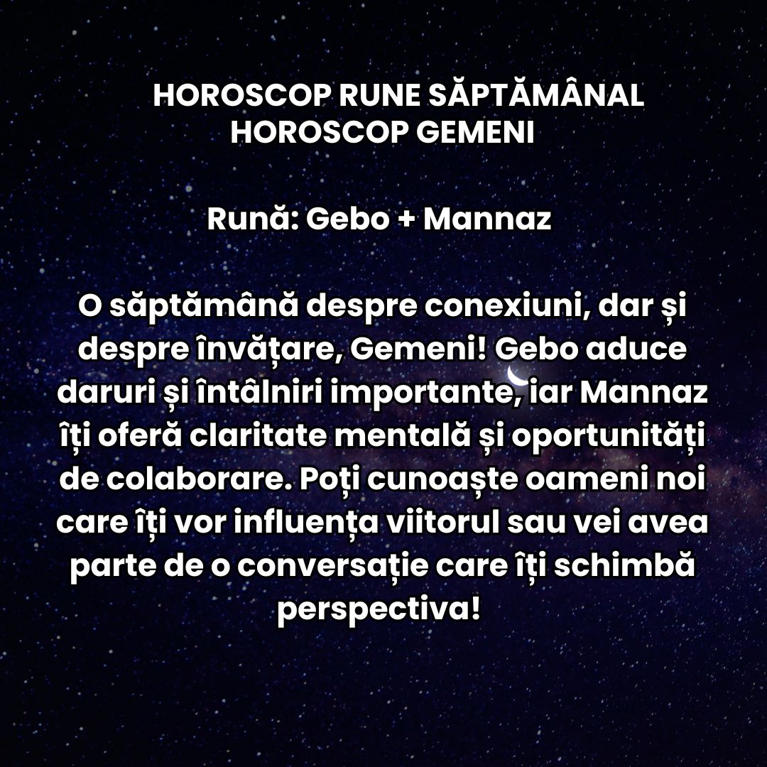 O săptămână despre conexiuni, dar și despre învățare, Gemeni! Gebo aduce daruri și întâlniri importante, iar Mannaz îți oferă claritate mentală și oportunități de colaborare. Poți cunoaște oameni noi care îți vor influența viitorul sau vei avea parte de o conversație care îți schimbă perspectiva. La muncă, se deschid noi drumuri – poate primești o ofertă tentantă sau cineva îți propune un proiect provocator. În plan personal, relațiile tale sunt pe un teren fertil – fie că este vorba de o prietenie care se aprofundează, fie de o conexiune romantică ce prinde contur. Dacă ai ezitat în a lua o decizie importantă, acesta este momentul să îți asculți intuiția și să faci un pas înainte.