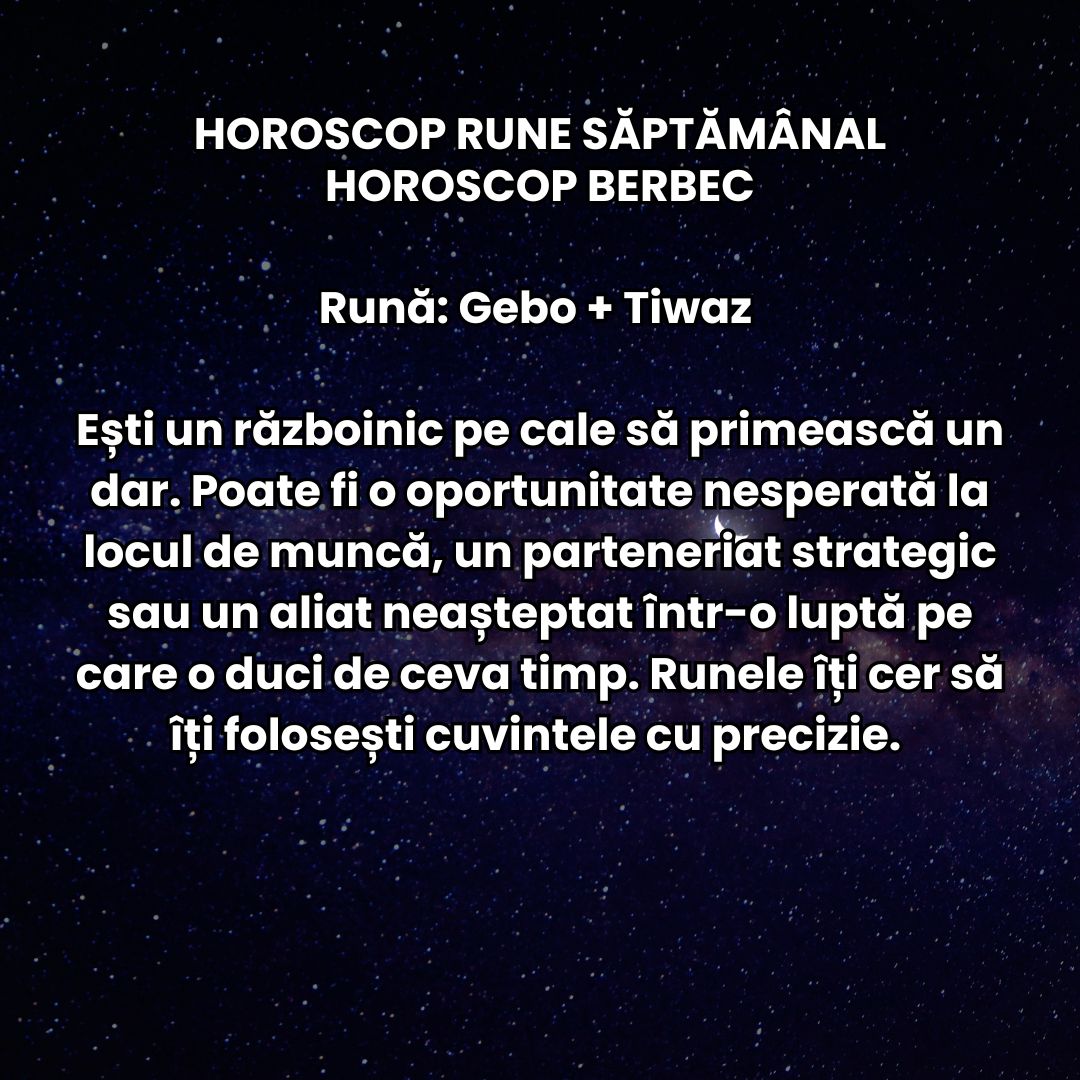 Ești un războinic pe cale să primească un dar. Poate fi o oportunitate nesperată la locul de muncă, un parteneriat strategic sau un aliat neașteptat într-o luptă pe care o duci de ceva timp. Runele îți cer să îți folosești cuvintele cu precizie, mai ales pe 24 martie, când Soarele și Mercur te pun în centrul atenției. Fie că îți susții punctul de vedere într-o ședință tensionată sau într-o conversație crucială cu un prieten, sinceritatea te va duce departe. Totuși, Tiwaz îți amintește că victoria vine cu un preț. Poți câștiga, dar ești pregătit pentru ceea ce urmează?