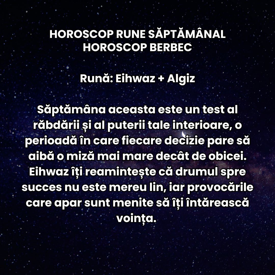 O săptămână de încercări, dar și de maturizare, în care răbdarea îți va fi cel mai bun aliat. Nauthiz te pune față în față cu obstacole care nu pot fi ocolite, ci doar înfruntate cu perseverență. Fie că este vorba despre un proiect la muncă ce nu pare să avanseze, o relație care necesită mai multă implicare sau o problemă de familie care te solicită emoțional, nu ai altă opțiune decât să mergi mai departe, chiar dacă ritmul pare frustrant de lent. Eihwaz îți oferă însă rezistența necesară pentru a nu renunța. Ai putea simți că totul se mișcă mai greu decât ți-ai dori, dar această perioadă îți permite să îți reevaluezi direcția și să îți întărești hotărârea. În viața personală, ai putea avea parte de o întâlnire care îți schimbă perspectiva asupra unui aspect important, fie în dragoste, fie într-o relație de prietenie. Sănătatea necesită mai multă atenție – semne subtile îți indică unde trebuie să faci ajustări. Ai nevoie de mai multă odihnă și de activități care să îți hrănească sufletul, așa că lasă deoparte grijile pentru câteva clipe și acordă-ți timpul de care ai nevoie.