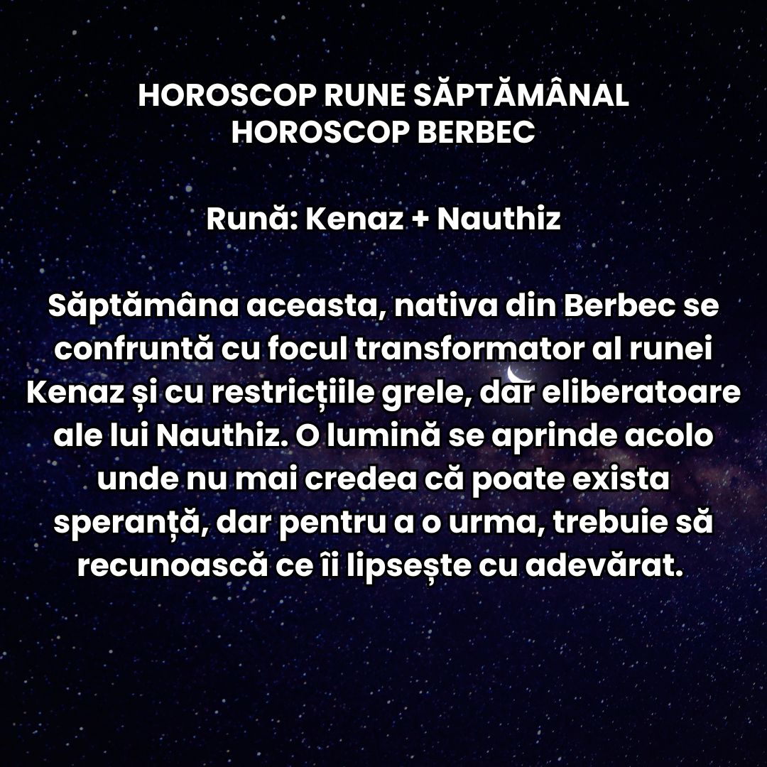 Săptămâna aceasta, nativa din Berbec se confruntă cu focul transformator al runei Kenaz și cu restricțiile grele, dar eliberatoare ale lui Nauthiz. O lumină se aprinde acolo unde nu mai credea că poate exista speranță, dar pentru a o urma, trebuie să recunoască ce îi lipsește cu adevărat. Relațiile de familie pot deveni apăsătoare, mai ales dacă cineva cere din nou mai mult decât poate oferi. La locul de muncă, provocările se țin lanț, dar tocmai ele îi oferă șansa să-și dovedească valoarea, să obțină recunoașterea unei contribuții pe care alții au trecut-o sub tăcere. Se regăsește în conversații târzii cu prieteni vechi, în planuri de vacanță care încep să prindă contur și în nopți de odihnă în care visează cu ochii deschiși la o schimbare de direcție. Poate chiar o pasiune artistică uitată se reaprinde. Întâlnește oameni noi care o provoacă să gândească altfel, iar dorința de romantism e acolo, mocnind, dar îi este teamă să o lase să ardă.