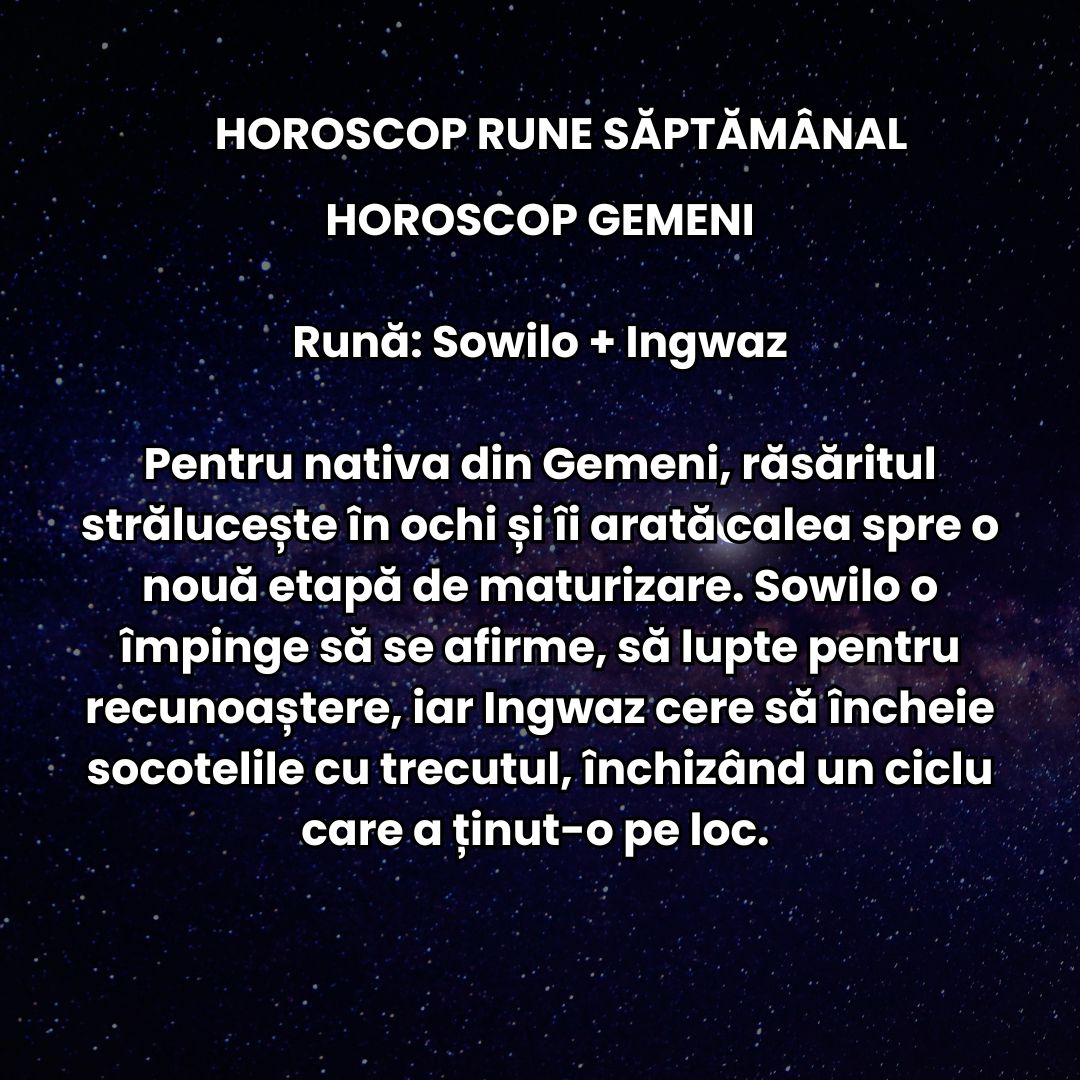 Pentru nativa din Gemeni, răsăritul strălucește în ochi și îi arată calea spre o nouă etapă de maturizare. Sowilo o împinge să se afirme, să lupte pentru recunoaștere, iar Ingwaz cere să încheie socotelile cu trecutul, închizând un ciclu care a ținut-o pe loc. La muncă, strălucește, dar este forțată să-și asume și greșelile, ceea ce poate fi obositor. În plan personal, reapare o figură din trecut, iar discuțiile pot fi aprinse, dar vindecătoare. Unele prietenii se întăresc, altele se sting fără dramă. Se bucură de mici momente de relaxare – o cafea într-un loc nou, o carte pe care nu o poate lăsa din mână, un hobby redescoperit. În dragoste, simte nevoia să iasă din superficial și să construiască ceva solid. Planuri de educație, poate chiar schimbarea domeniului de activitate, prind contur. Sănătatea e stabilă, dar doar dacă nu ignoră semnalele subtile ale corpului.