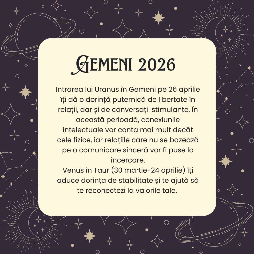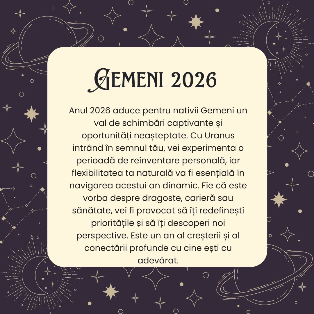 Anul 2026 aduce pentru nativii Gemeni un val de schimbări captivante și oportunități neașteptate. Cu Uranus intrând în semnul tău, vei experimenta o perioadă de reinventare personală, iar flexibilitatea ta naturală va fi esențială în navigarea acestui an dinamic. Fie că este vorba despre dragoste, carieră sau sănătate, vei fi provocat să îți redefinești prioritățile și să îți descoperi noi perspective. Este un an al creșterii și al conectării profunde cu cine ești cu adevărat.