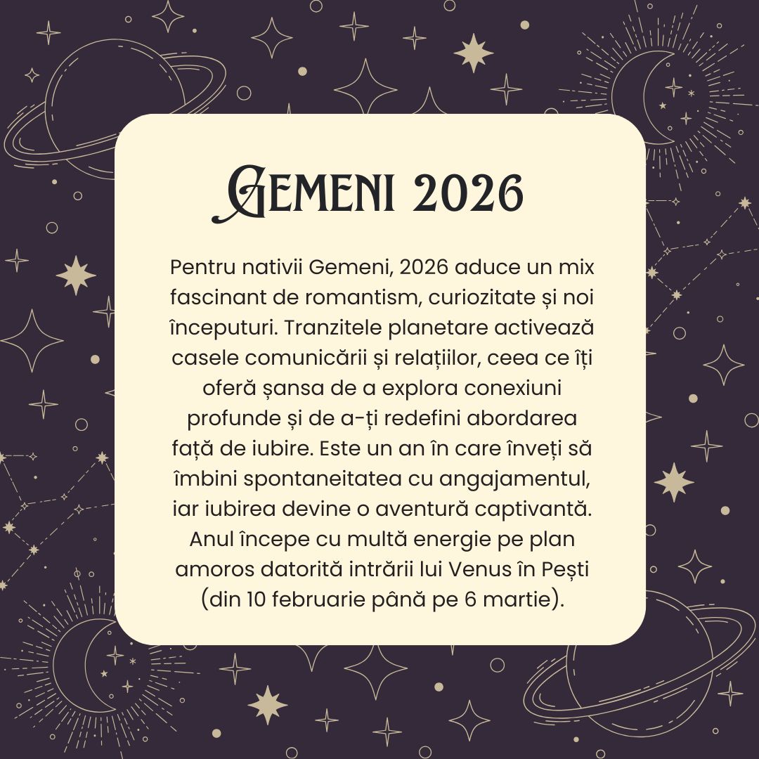 Pentru nativii Gemeni, 2026 aduce un mix fascinant de romantism, curiozitate și noi începuturi. Tranzitele planetare activează casele comunicării și relațiilor, ceea ce îți oferă șansa de a explora conexiuni profunde și de a-ți redefini abordarea față de iubire. Este un an în care înveți să îmbini spontaneitatea cu angajamentul, iar iubirea devine o aventură captivantă.