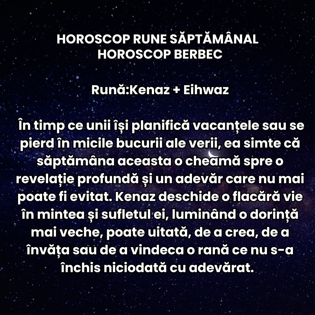 În timp ce unii își planifică vacanțele sau se pierd în micile bucurii ale verii, ea simte că săptămâna aceasta o cheamă spre o revelație profundă și un adevăr care nu mai poate fi evitat. Kenaz deschide o flacără vie în mintea și sufletul ei, luminând o dorință mai veche, poate uitată, de a crea, de a învăța sau de a vindeca o rană ce nu s-a închis niciodată cu adevărat. Poate că în jurul ei totul pare vesel, cu ieșiri spontane cu prietenii și conversații efervescente, dar înăuntru se naște o nevoie de retragere, de liniște, de introspecție. Eihwaz o pune în contact cu rezistența sa interioară — poate fi o perioadă cu provocări la muncă, conflicte mocnite în familie sau o stare de sănătate care cere mai multă grijă și disciplină. Și totuși, în mijlocul acestui haos tăcut, se poate simți o înnoire, o forță care o îndeamnă să-și rescrie drumul. Întâlnirea cu o persoană nouă ar putea deveni catalizatorul unui nou început, dar numai dacă are curajul să spună adevărul.