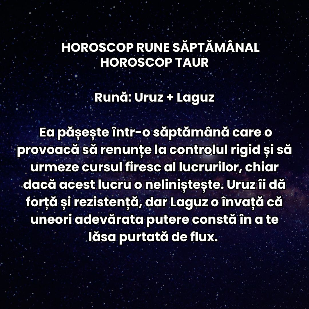 Ea pășește într-o săptămână care o provoacă să renunțe la controlul rigid și să urmeze cursul firesc al lucrurilor, chiar dacă acest lucru o neliniștește. Uruz îi dă forță și rezistență, dar Laguz o învață că uneori adevărata putere constă în a te lăsa purtată de flux. La muncă apar schimbări bruște — o decizie neașteptată de la superiori sau o redistribuire a rolurilor care o forțează să iasă din zona de confort. În viața personală, poate simți o nevoie intensă de reconectare emoțională, de timp petrecut în tihnă alături de cei dragi sau într-o activitate creativă care îi aduce alinare. Apar momente de oboseală psihică, dar și revelații legate de un vis vechi sau o pasiune abandonată. Să nu se mire dacă se trezește căutând cursuri, podcasturi sau surse de educație care să o inspire. Este o săptămână pentru vindecare prin curgere, nu prin forțare.