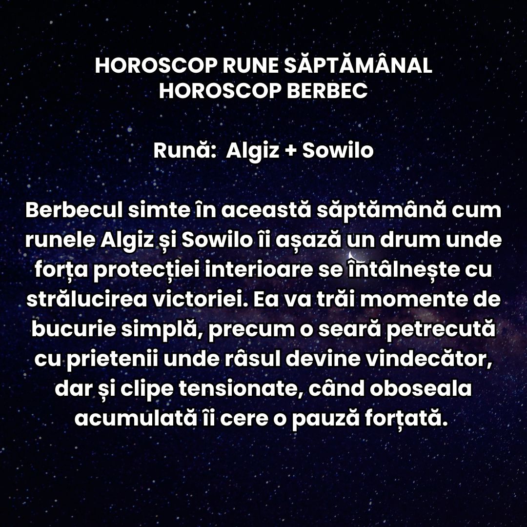 Berbecul simte în această săptămână cum runele Algiz și Sowilo îi așază un drum unde forța protecției interioare se întâlnește cu strălucirea victoriei. Ea va trăi momente de bucurie simplă, precum o seară petrecută cu prietenii unde râsul devine vindecător, dar și clipe tensionate, când oboseala acumulată îi cere o pauză forțată. La muncă, se confruntă cu provocări neașteptate, proiecte care par să se împotmolească, dar care prin perseverență se transformă în oportunități de a-și demonstra valoarea și de a primi recunoaștere. În viața personală, apar întâlniri cu oameni noi, care aduc inspirație și o altă lumină asupra relațiilor, în timp ce acasă poate fi nevoită să facă față unui conflict de familie care o consumă emoțional. Totuși, Sowilo o împinge spre claritate, și ea înțelege că un nou început se conturează la orizont, fie prin planificarea unei vacanțe, fie prin schimbarea modului în care își organizează rutina zilnică.