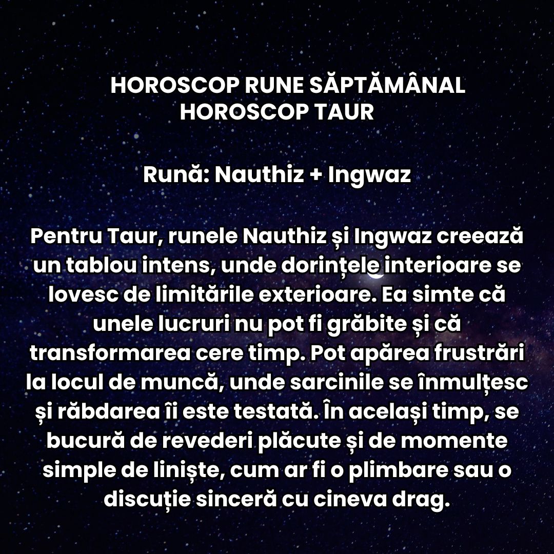 Pentru Taur, runele Nauthiz și Ingwaz creează un tablou intens, unde dorințele interioare se lovesc de limitările exterioare. Ea simte că unele lucruri nu pot fi grăbite și că transformarea cere timp. Pot apărea frustrări la locul de muncă, unde sarcinile se înmulțesc și răbdarea îi este testată. În același timp, se bucură de revederi plăcute și de momente simple de liniște, cum ar fi o plimbare sau o discuție sinceră cu cineva drag. În dragoste, poate resimți un val de pasiune, dar și de tensiune, fiindcă dorința de siguranță se ciocnește cu imprevizibilul. Nauthiz o obligă să înfrunte propriile nevoi, în timp ce Ingwaz îi arată că, după răbdare, vine renașterea, iar aceasta poate fi simțită chiar printr-un pas mic, cum ar fi o nouă disciplină de sănătate, un hobby pe care îl redescoperă sau o decizie legată de viitor.