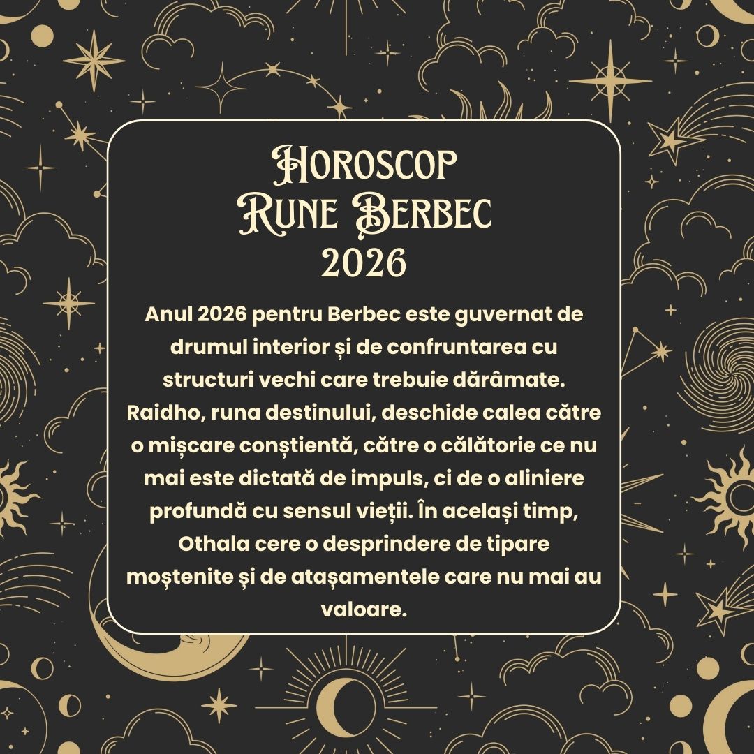 Anul 2026 pentru Berbec este guvernat de drumul interior și de confruntarea cu structuri vechi care trebuie dărâmate. Raidho, runa destinului, deschide calea către o mișcare conștientă, către o călătorie ce nu mai este dictată de impuls, ci de o aliniere profundă cu sensul vieții. În același timp, Othala cere o desprindere de tipare moștenite și de atașamentele care nu mai au valoare, iar Kenaz aprinde lumina în întuneric, arătându-ți darul cunoașterii și al creativității. Întregul an devine astfel o inițiere în ritmul sacru al schimbării: a învăța să mergi, să renunți și să luminezi.