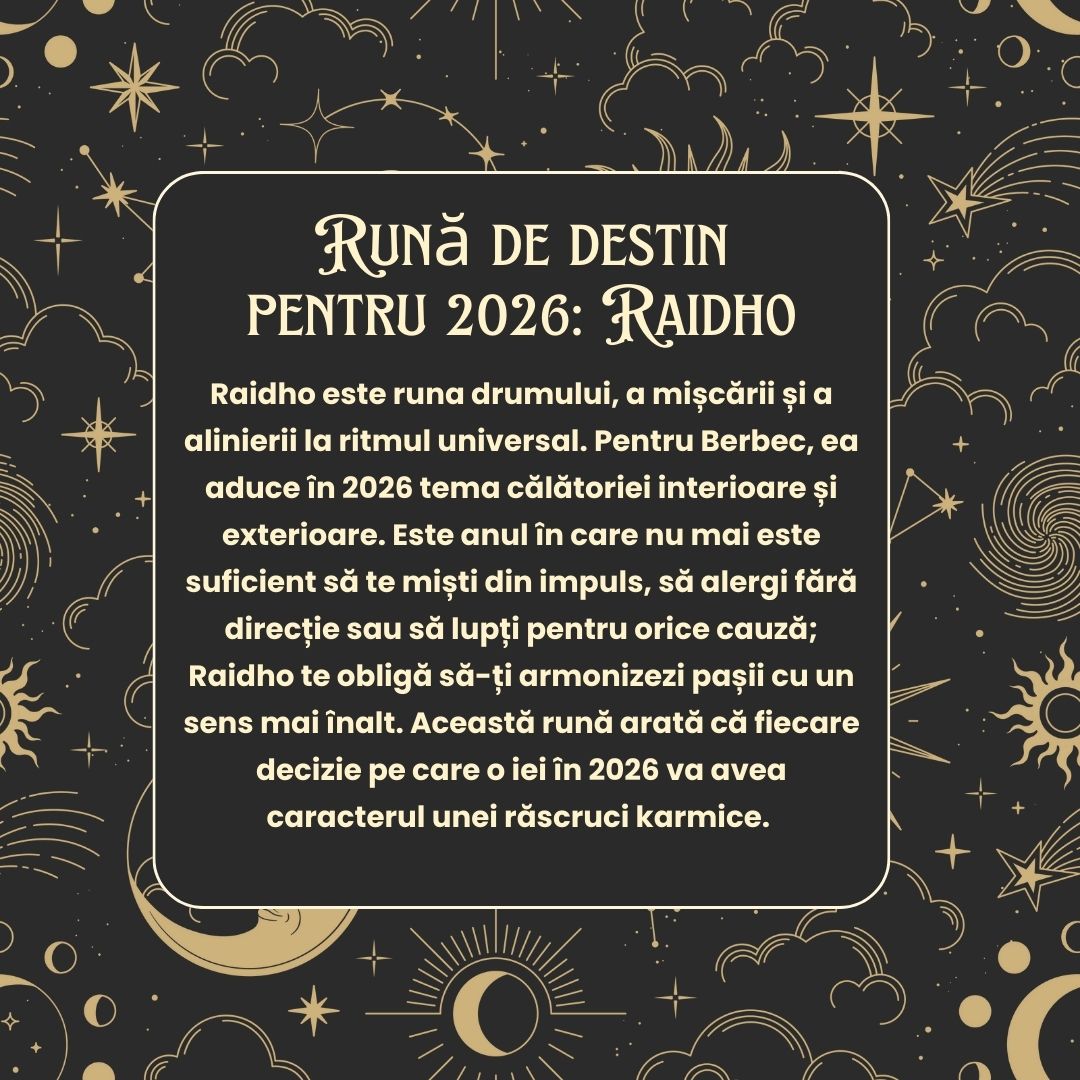 Raidho este runa drumului, a mișcării și a alinierii la ritmul universal. Pentru Berbec, ea aduce în 2026 tema călătoriei interioare și exterioare. Este anul în care nu mai este suficient să te miști din impuls, să alergi fără direcție sau să lupți pentru orice cauză; Raidho te obligă să-ți armonizezi pașii cu un sens mai înalt.