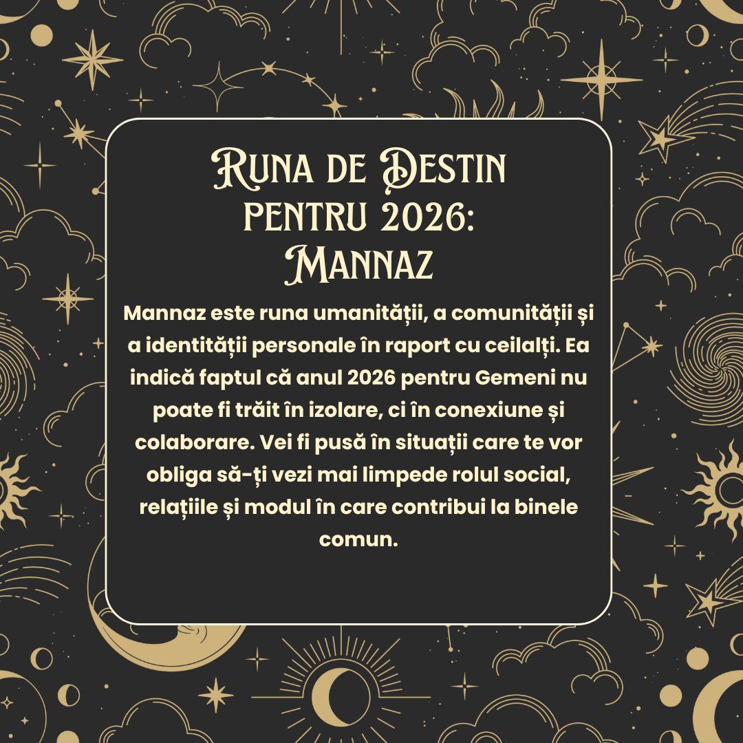Mannaz este runa umanității, a comunității și a identității personale în raport cu ceilalți. Ea indică faptul că anul 2026 pentru Gemeni nu poate fi trăit în izolare, ci în conexiune și colaborare. Vei fi pusă în situații care te vor obliga să-ți vezi mai limpede rolul social, relațiile și modul în care contribui la binele comun.
