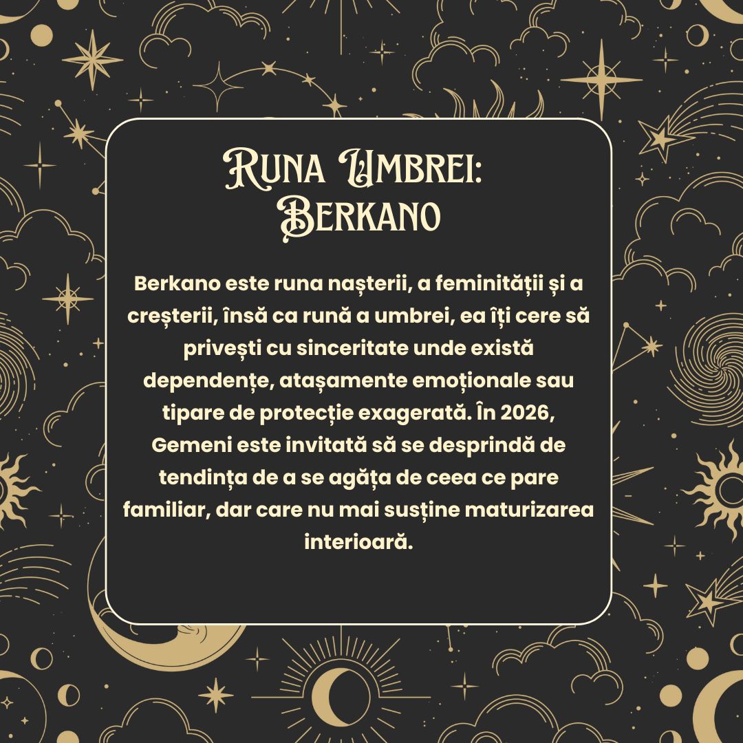 Berkano este runa nașterii, a feminității și a creșterii, însă ca rună a umbrei, ea îți cere să privești cu sinceritate unde există dependențe, atașamente emoționale sau tipare de protecție exagerată. În 2026, Gemeni este invitată să se desprindă de tendința de a se agăța de ceea ce pare familiar, dar care nu mai susține maturizarea interioară.