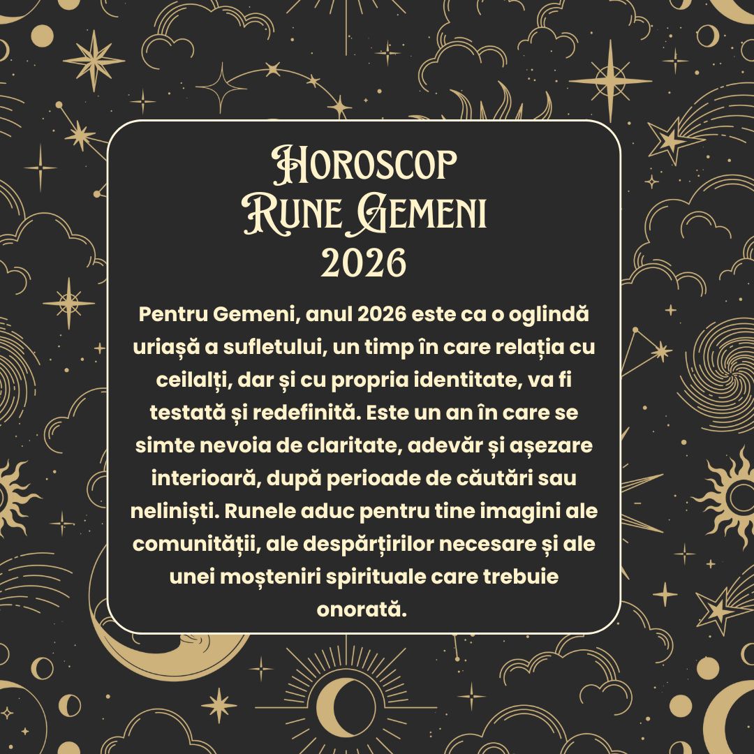 Pentru Gemeni, anul 2026 este ca o oglindă uriașă a sufletului, un timp în care relația cu ceilalți, dar și cu propria identitate, va fi testată și redefinită. Este un an în care se simte nevoia de claritate, adevăr și așezare interioară, după perioade de căutări sau neliniști. Runele aduc pentru tine imagini ale comunității, ale despărțirilor necesare și ale unei moșteniri spirituale care trebuie onorată. Totul se leagă într-un proces de maturizare, în care înțelegi mai bine locul tău între oameni și rădăcinile tale interioare.
