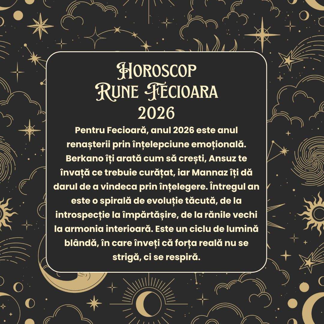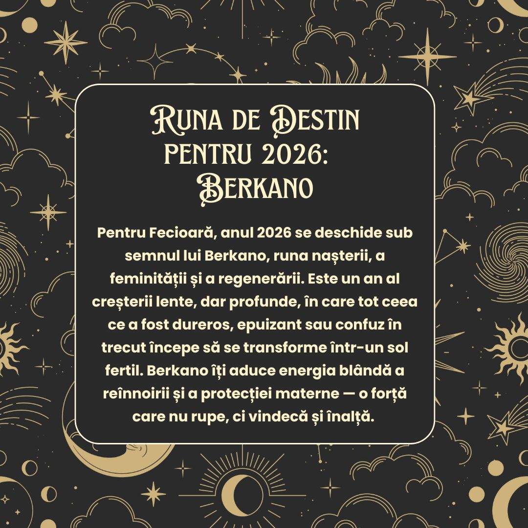 Pentru Fecioară, anul 2026 se deschide sub semnul lui Berkano, runa nașterii, a feminității și a regenerării. Este un an al creșterii lente, dar profunde, în care tot ceea ce a fost dureros, epuizant sau confuz în trecut începe să se transforme într-un sol fertil. Berkano îți aduce energia blândă a reînnoirii și a protecției materne — o forță care nu rupe, ci vindecă și înalță. Fecioara pășește într-o etapă a înfloririi, în care învățătura trecutului se transformă în înțelepciune, iar vulnerabilitatea devine putere.