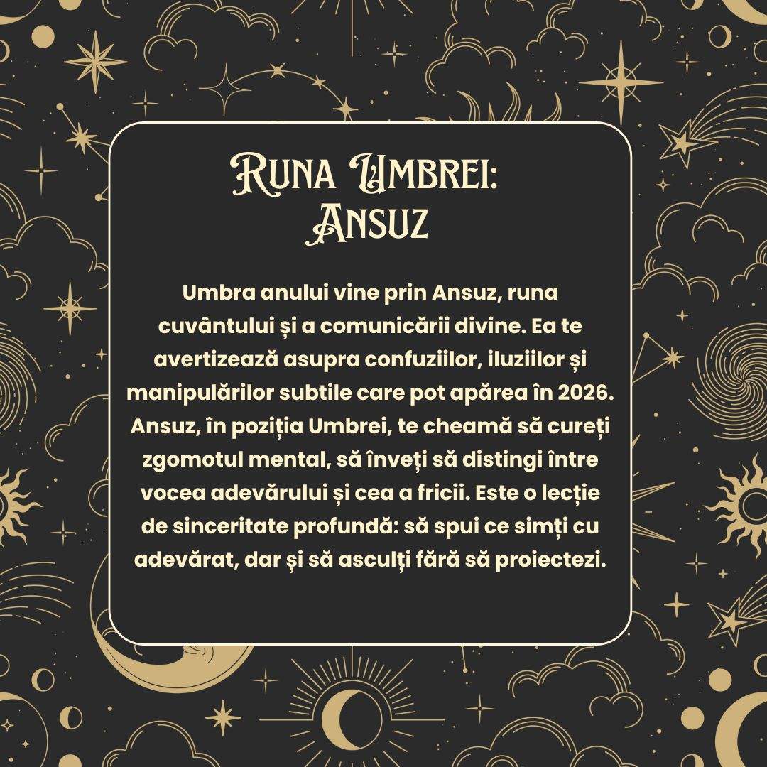 Umbra anului vine prin Ansuz, runa cuvântului și a comunicării divine. Ea te avertizează asupra confuziilor, iluziilor și manipulărilor subtile care pot apărea în 2026. Ansuz, în poziția Umbrei, te cheamă să cureți zgomotul mental, să înveți să distingi între vocea adevărului și cea a fricii. Este o lecție de sinceritate profundă: să spui ce simți cu adevărat, dar și să asculți fără să proiectezi. Pentru Fecioară, provocarea va fi să renunțe la perfecțiunea discursului și să îmbrățișeze vulnerabilitatea autentică a inimii.