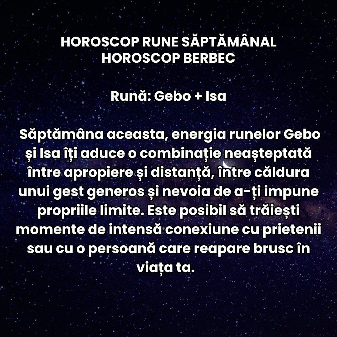 Săptămâna aceasta, energia runelor Gebo și Isa îți aduce o combinație neașteptată între apropiere și distanță, între căldura unui gest generos și nevoia de a-ți impune propriile limite. Este posibil să trăiești momente de intensă conexiune cu prietenii sau cu o persoană care reapare brusc în viața ta, însă ceva din interiorul tău te îndeamnă să nu te grăbești. La locul de muncă, ai parte de o provocare care te obligă să-ți arăți maturitatea și calmul, chiar dacă ritmul e haotic. În familie, se cere răbdare — cineva are nevoie de tine, dar nu știe cum să o spună. Odihna devine o formă de supraviețuire, mai ales că sănătatea ar putea da semne de oboseală spre mijlocul săptămânii. Totuși, finalul aduce recunoștință și liniște: realizezi că ești exact acolo unde trebuie, chiar dacă drumul s-a răcit pentru o clipă.