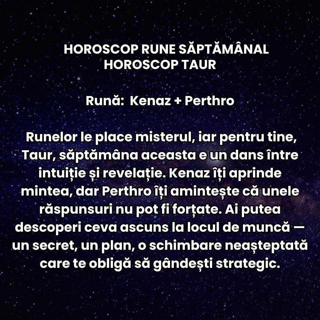 Runelor le place misterul, iar pentru tine, Taur, săptămâna aceasta e un dans între intuiție și revelație. Kenaz îți aprinde mintea, dar Perthro îți amintește că unele răspunsuri nu pot fi forțate. Ai putea descoperi ceva ascuns la locul de muncă — un secret, un plan, o schimbare neașteptată care te obligă să gândești strategic. În plan personal, romantismul se întețește, dar și tentațiile. O întâlnire aparent întâmplătoare poate schimba ceva în tine, reamintindu-ți cât de viu e focul pasiunii. Totuși, e important să te odihnești, pentru că mintea ta va lucra intens. Spre final de săptămână, o veste legată de bani sau de o colaborare veche îți confirmă că norocul vine exact când ești dispus să te desprinzi de vechiul tău tipar.