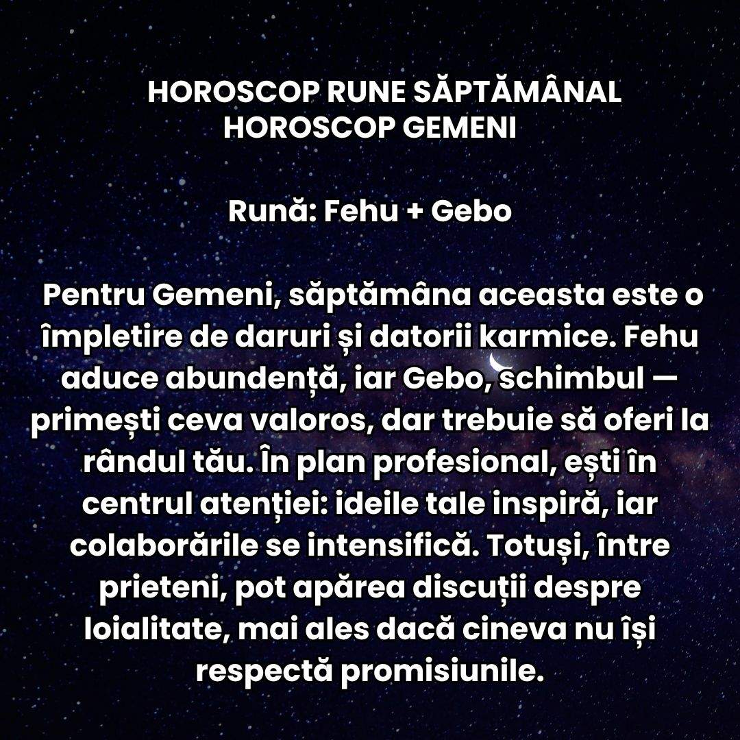 Pentru Gemeni, săptămâna aceasta este o împletire de daruri și datorii karmice. Fehu aduce abundență, iar Gebo, schimbul — primești ceva valoros, dar trebuie să oferi la rândul tău. În plan profesional, ești în centrul atenției: ideile tale inspiră, iar colaborările se intensifică. Totuși, între prieteni, pot apărea discuții despre loialitate, mai ales dacă cineva nu își respectă promisiunile. În dragoste, runele vorbesc despre reciprocitate — e timpul să vezi dacă celălalt îți oferă la fel de mult cât oferi tu. Pe plan personal, îți prinde bine o pauză, o zi în care să te rupi de tot și să te regăsești. În weekend, un eveniment social sau o revedere neașteptată îți readuce zâmbetul și energia de a merge mai departe.