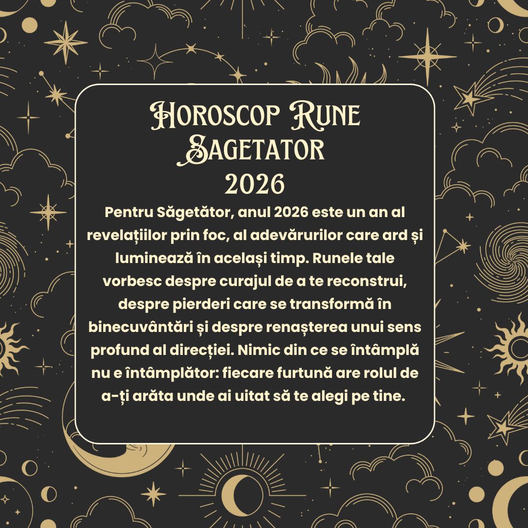 Pentru Săgetător, anul 2026 este un an al revelațiilor prin foc, al adevărurilor care ard și luminează în același timp. Runele tale vorbesc despre curajul de a te reconstrui, despre pierderi care se transformă în binecuvântări și despre renașterea unui sens profund al direcției. Nimic din ce se întâmplă nu e întâmplător: fiecare furtună are rolul de a-ți arăta unde ai uitat să te alegi pe tine. Este un an în care ești chemată să devii flacăra care nu se teme să ardă — și nici să lumineze pentru ceilalți.